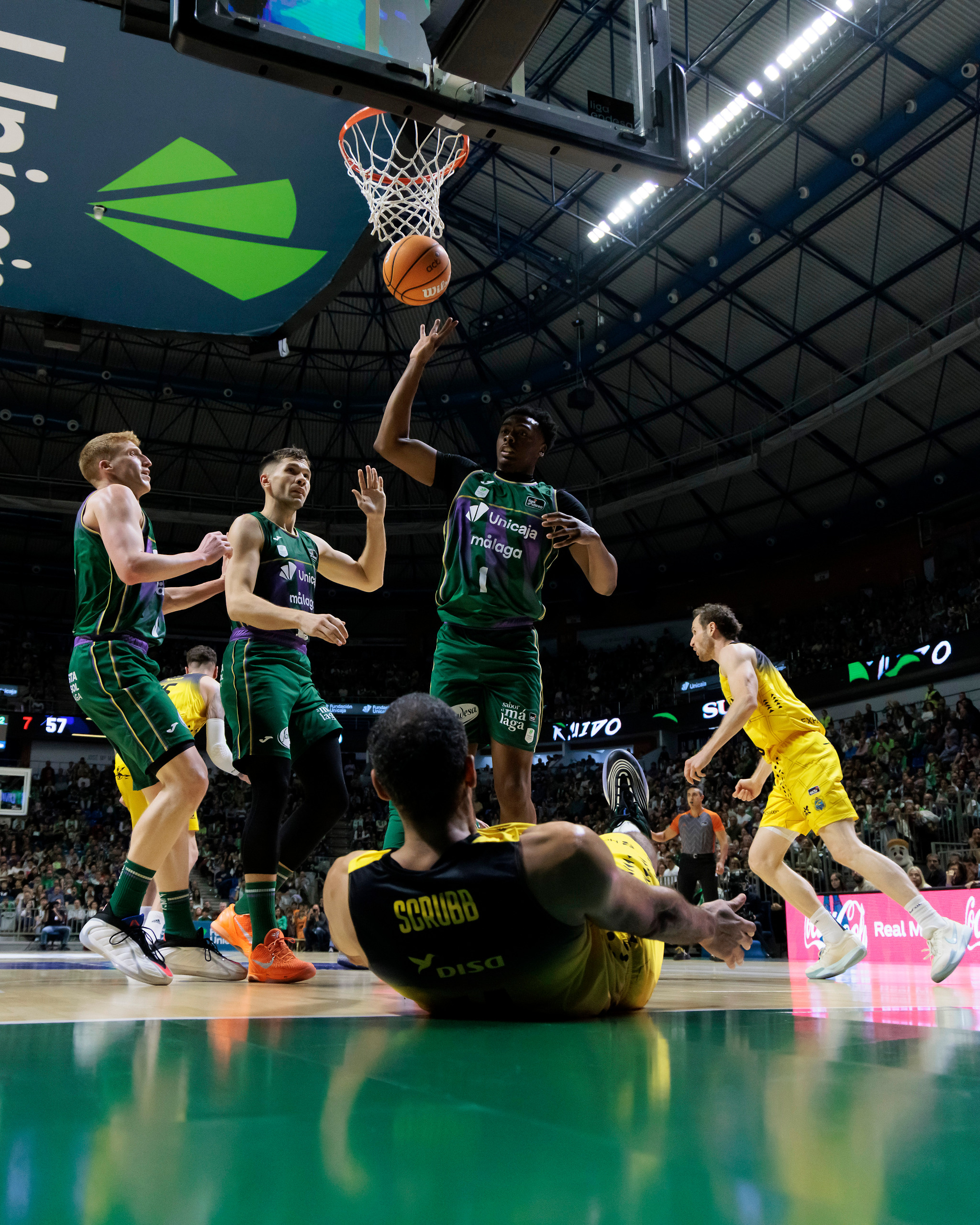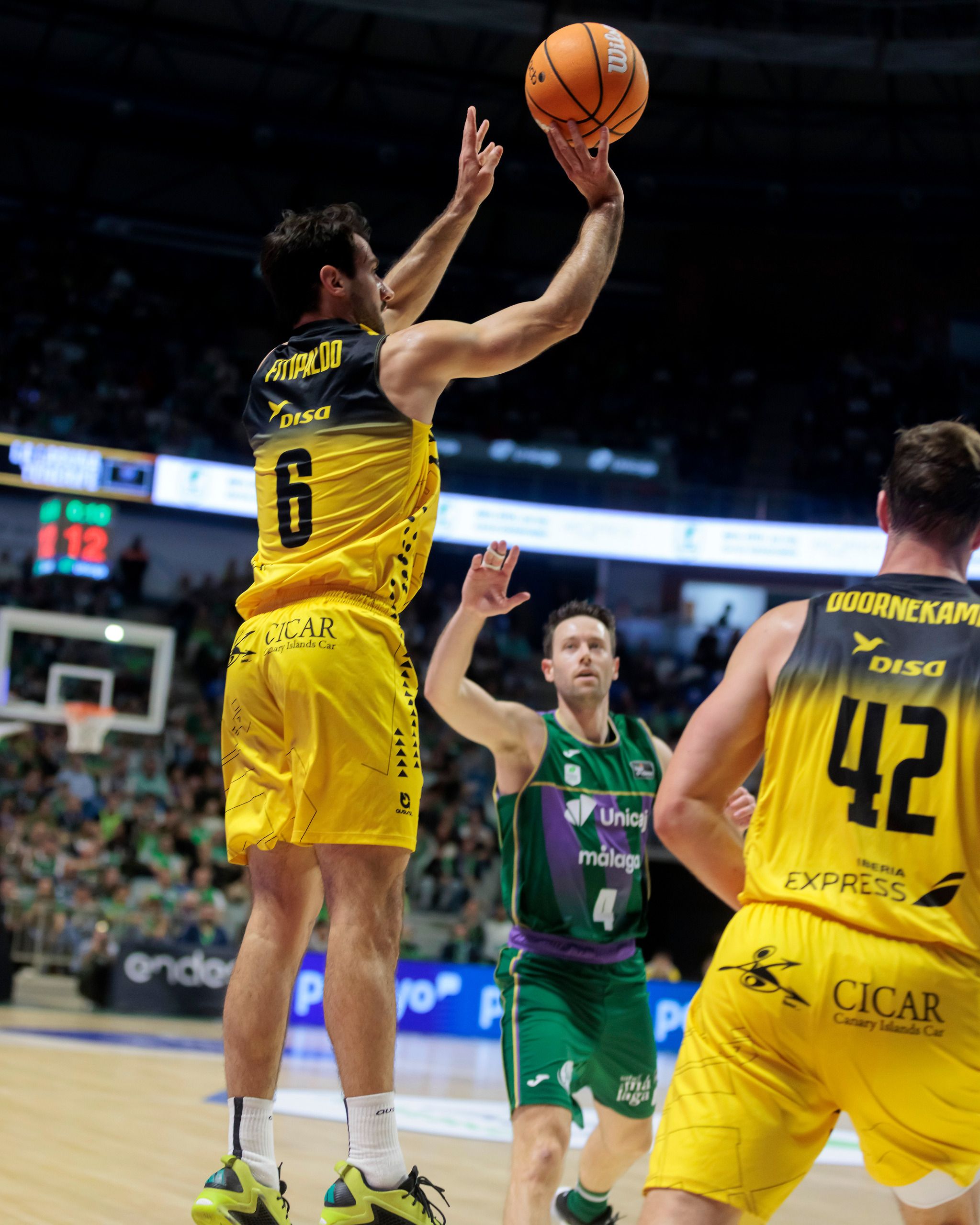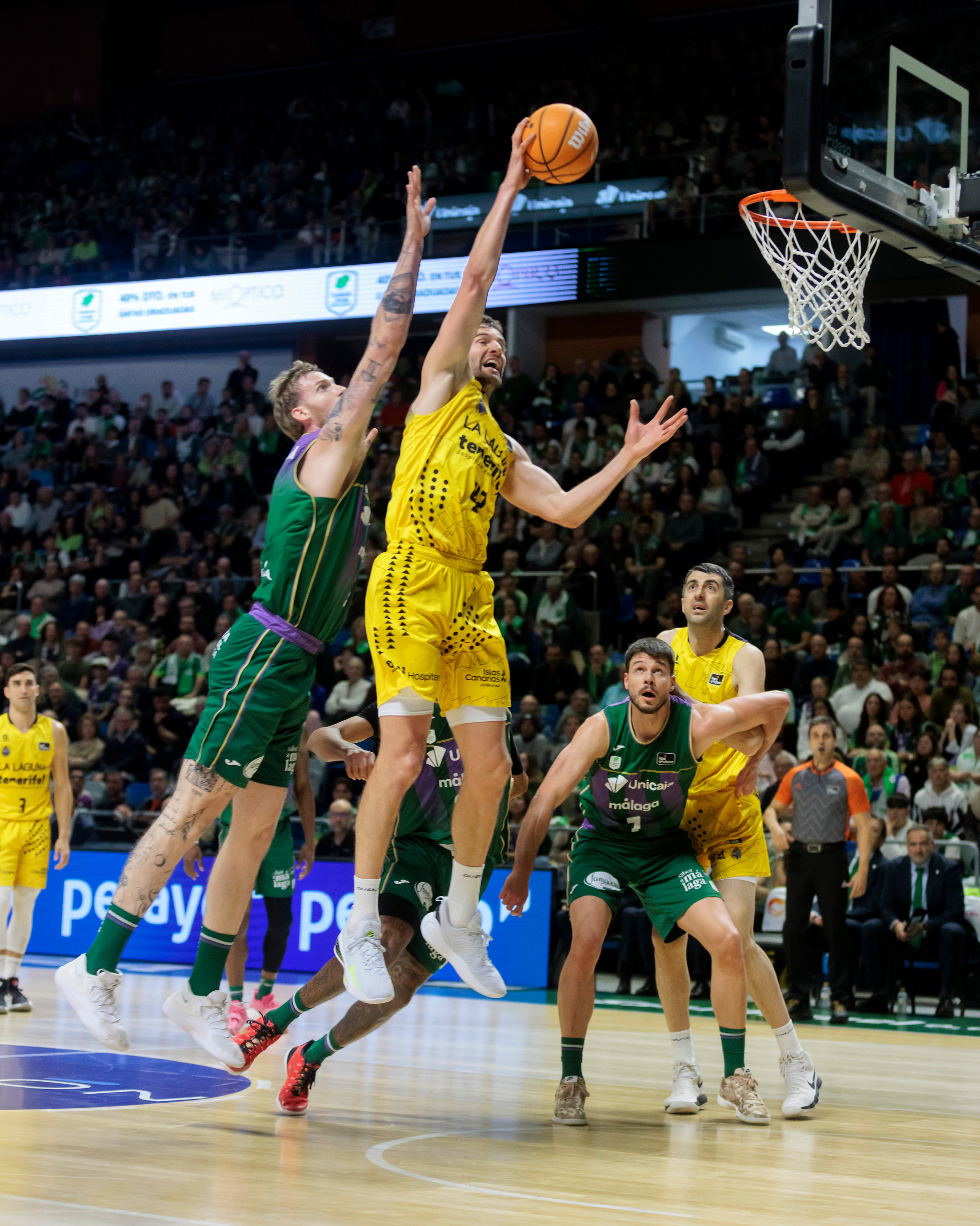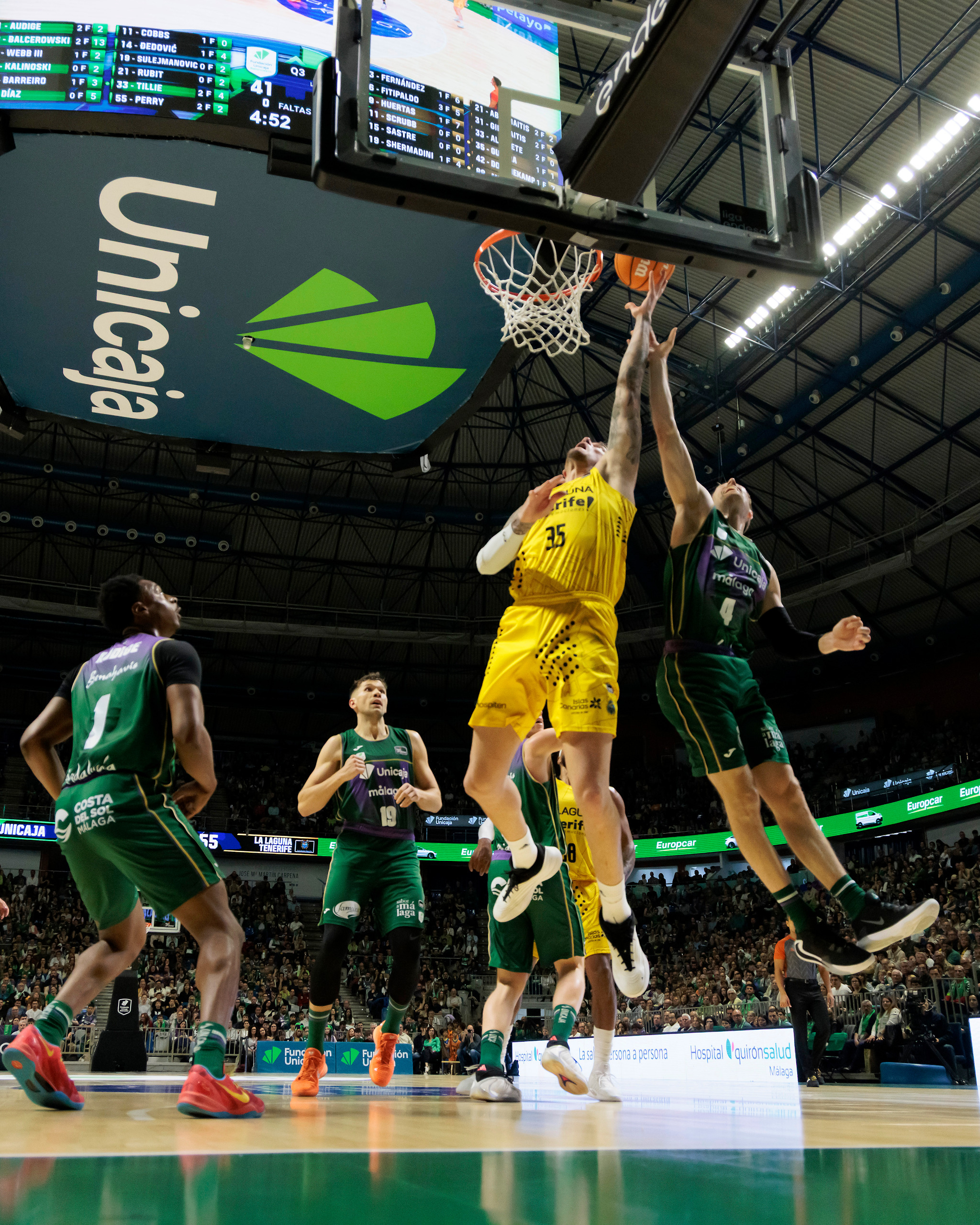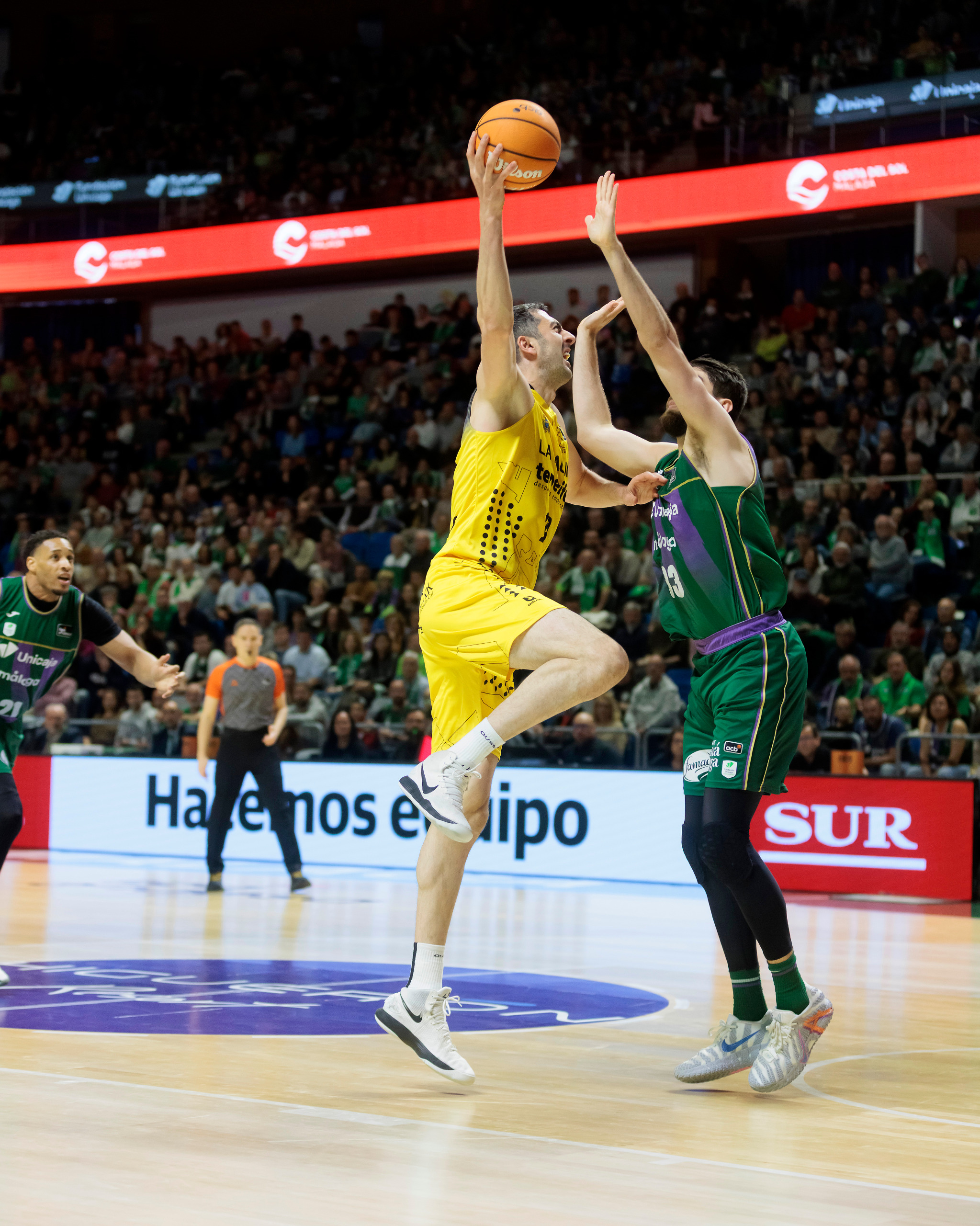 Unicaja no encontró soluciones. Las rotaciones no cambiaron el guion y el equipo malagueño, incómodo en todo momento ante el repasito tinerfeño, se marchó al descanso claramente por detrás (30-46), tras un triple final de Huertas que reflejaba la superioridad aurinegra.