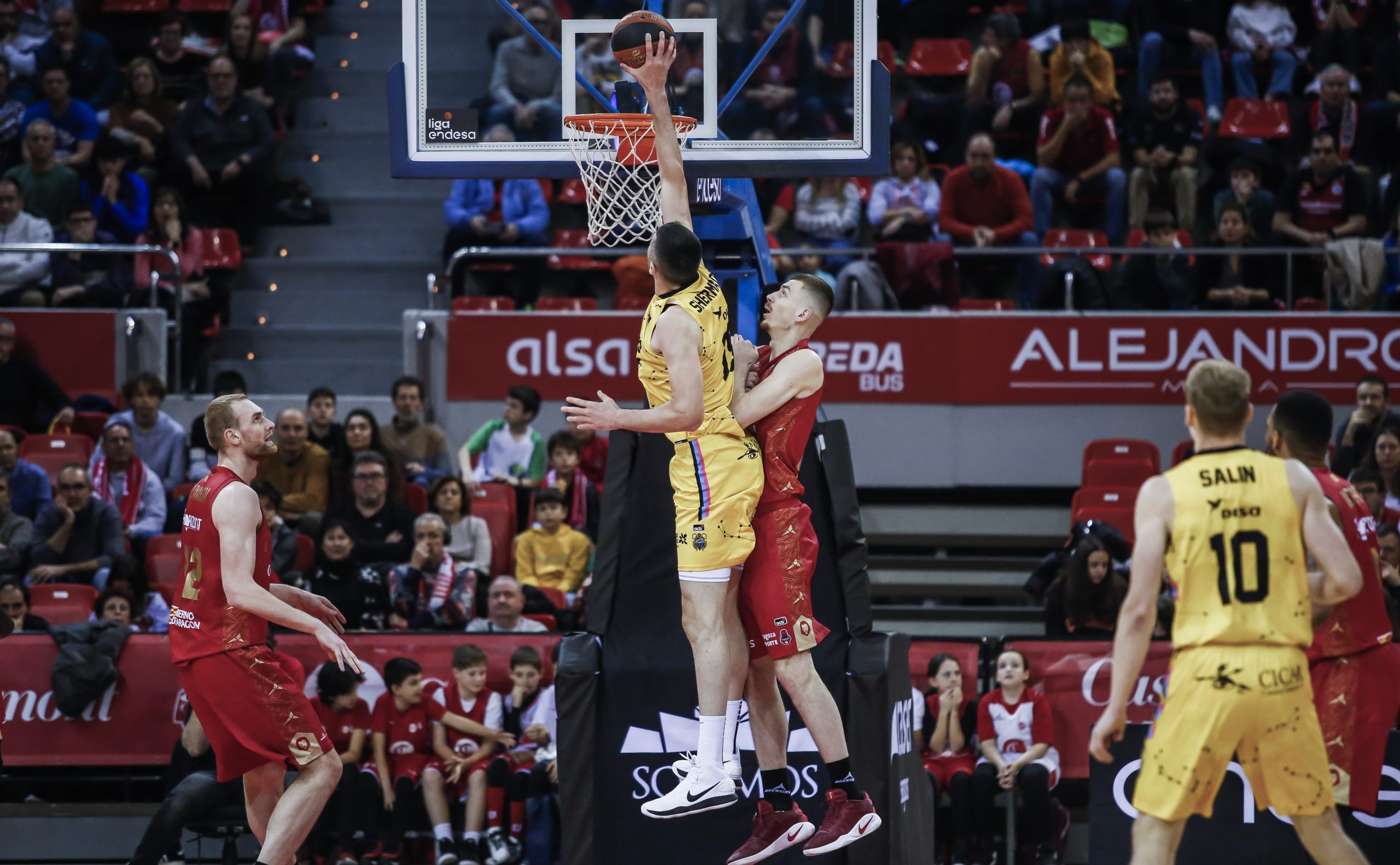 De nuevo tras el descanso los locales se colocaron pronto a cinco puntos pero fue un efecto gaseosa porque con dos triples Fitipaldo volvió a relanzar a los suyos que, mediado este cuarto, vencían por 15 puntos (37-52) ante la falta de acierto local. Sin embargo, el conjunto ‘rojillo’, puso corazón y con empuje y con mucha actividad defensiva consiguió volver a la vida buscando puntos interiores cuando parecía que el tren del partido había pasado de largo porque alcanzó la orilla del último parcial siete abajo (50-57) y se colocó a dos (55-57) en el minuto 32. Había partido, algo que quedó patente en un cuarto final tremendamente emocionante en el que la defensa en zona de los aragoneses puso en muchos aprietos a los isleños hasta el punto de que el equipo de Porfirio Fisac se colocó por delante en el 35 con un gran Tryggvi Hlinason.