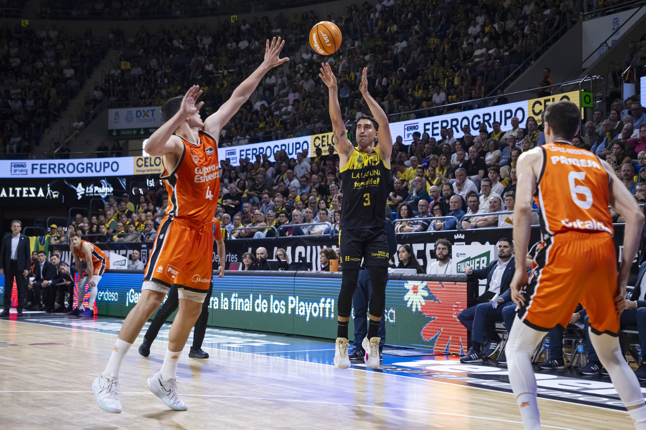 El segundo cuarto fue un nuevo recital de Montero, quien alcanzó los 18 puntos antes del descanso. A su lado, Jones y López-Aróstegui ampliaron la renta taronja por encima de los diez puntos (31-41). Aunque Huertas clavó un triple y Shermadini encadenó dos canastas tras bloqueos, el acierto exterior valenciano neutralizó cualquier atisbo de remontada. El conjunto visitante siguió ampliando la brecha hasta los 13 puntos tras una acción a tablero de Pradilla (43-56), que puso en evidencia las dificultades defensivas del Canarias de La Laguna.