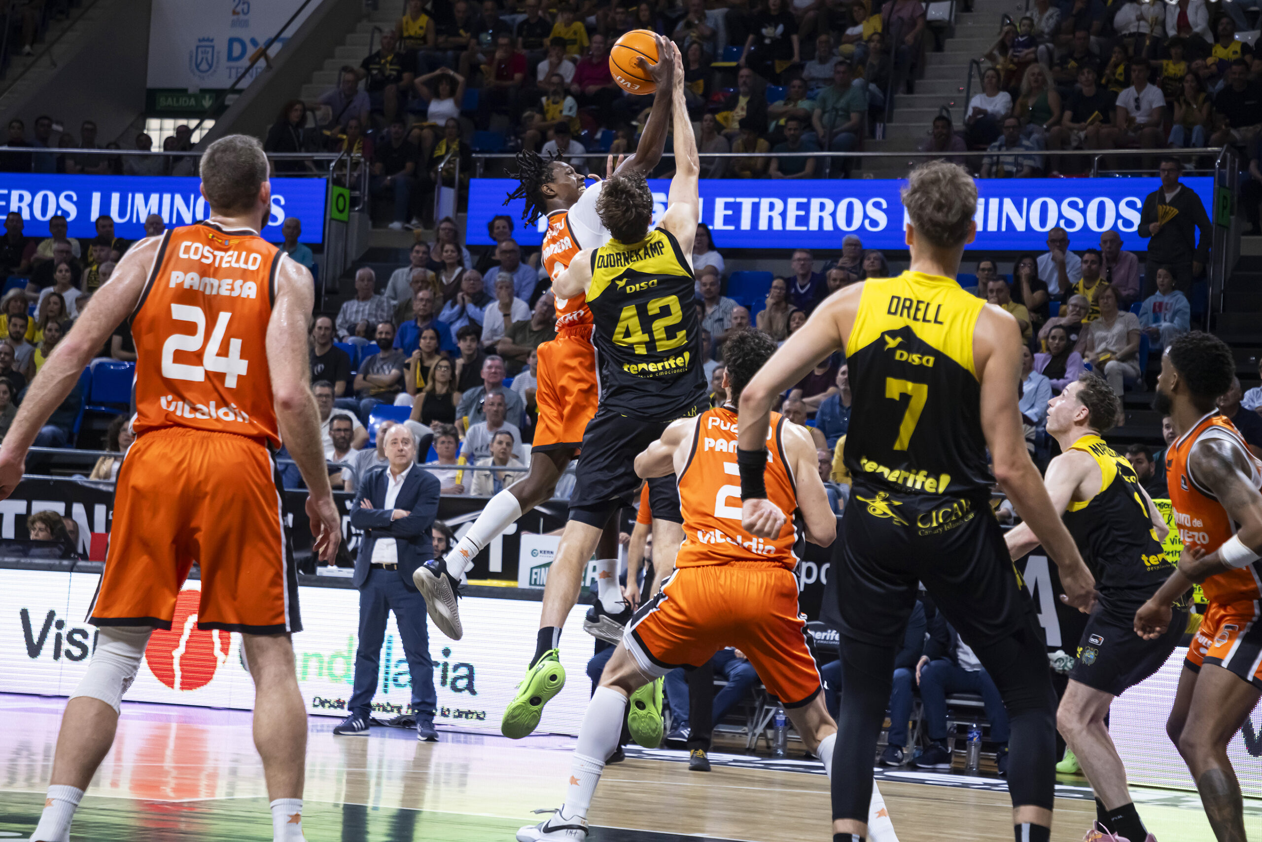 A pesar de ese mazazo, el equipo tinerfeño se sostuvo en el partido gracias a la inspiración de Jaime Fernández y Marcelinho Huertas. A dos minutos del cierre del primer cuarto, lograron acercarse (19-21), y una penetración de Kostadinov devolvió el empate (23-23), en una acción que provocó una airada protesta de Txus Vidorreta. El técnico local se ganó una técnica que los taronjas aprovecharon para cerrar el primer acto con ventaja (23-26).