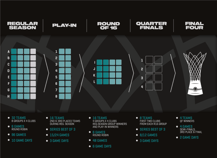 Segunda fase: Los primeros clasificados de cada grupo pasan a la siguiente fase, mientras que los equipos que ocupen la segunda y tercera plaza de cada grupo disputarán un Play-in del que saldrán los 8 equipos que completan ese Top 16.