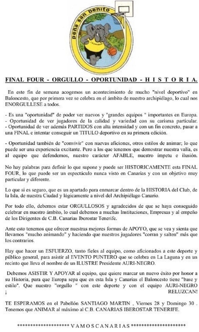 La Peña San Benito, fiel al Club Baloncesto Canarias desde 1979, ha remitido un comunicado dirigido a los aficionados aurinegros de cara a lograr el máximo apoyo y colorido en las gradas del pabellón de Tenerife Santiago Martín.
