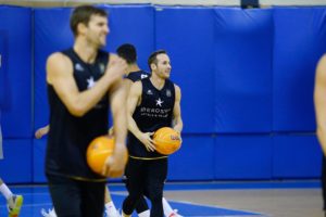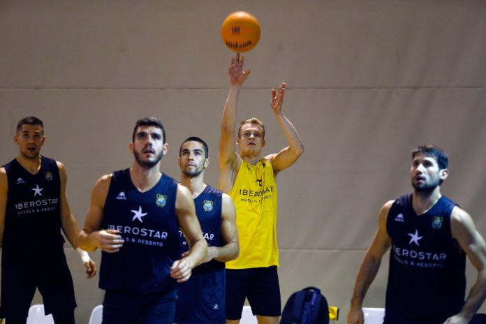 El Iberostar Tenerife completó su penúltimo entrenamiento en una pista auxiliar del O.A.C.A. Olympic Indoor Hall Nicos Gallis, antes del partido que le enfrentará mañana al Casademont Zaragoza (19:30 hora canaria, SuperBasket Canarias Radio en directo desde Grecia), por una plaza en las semifinales de la Final8 de la Basketball Champions League 2019-20. El buen ambiente marcó la tarde de trabajo aurinegra en el impresionante coliseo deportivo heleno, que se inició tras realizar las fotos oficiales, así como los vídeos, en los que se sucedieron las bromas entre los propios jugadores canaristas así como el personal de la Basketball Champions League.