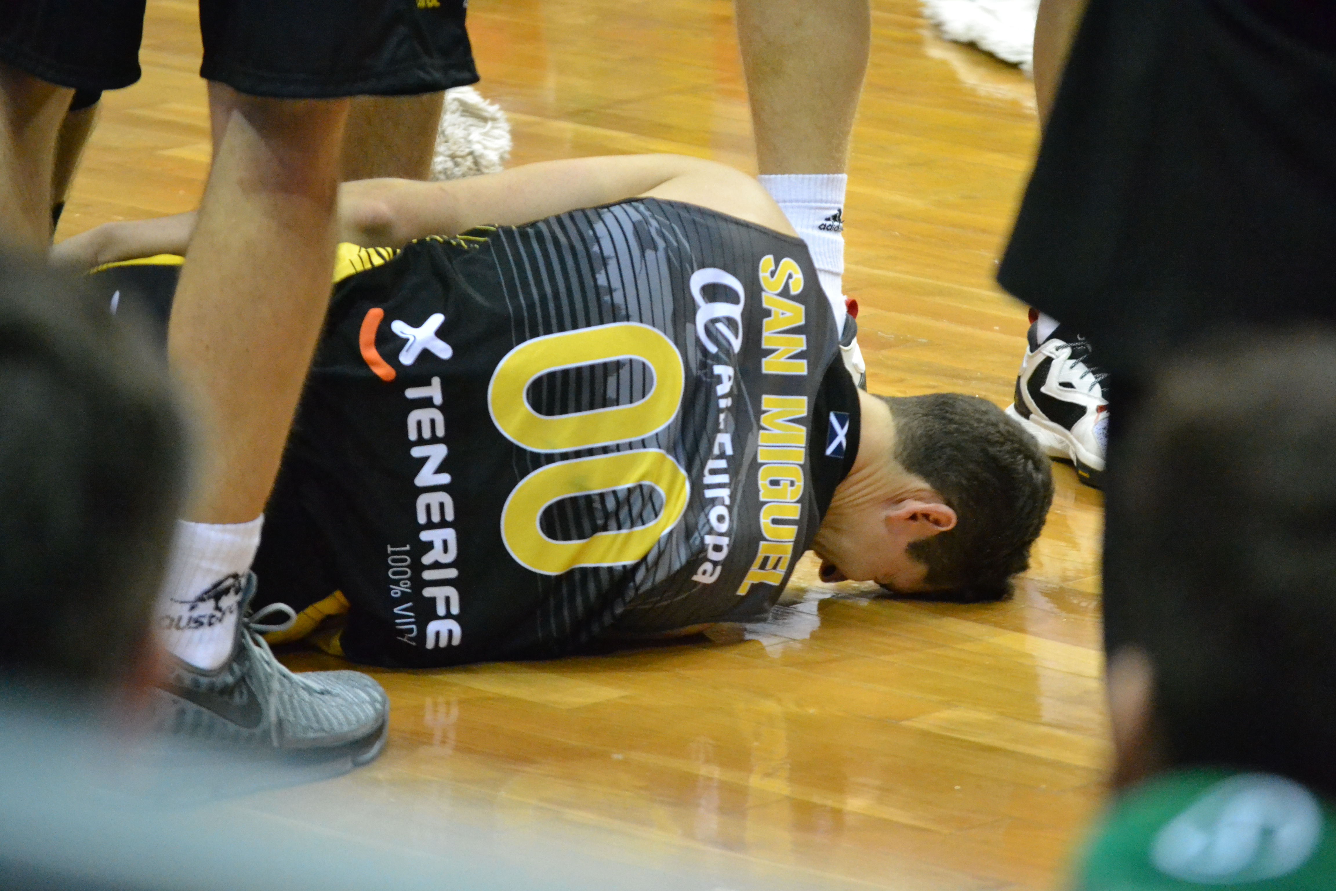 El Santiago Martín contuvo la respiración a falta de 8’16” para el final del partido. Rodrigo San Miguel chocaba contra el pívot visitante Jordan y se quedaba tendido en el suelo con claros gestos de dolor. El base aurinegro se tuvo que retirar del partido. Fue la nota negativa de la victoria canarista ante el Joventut.
