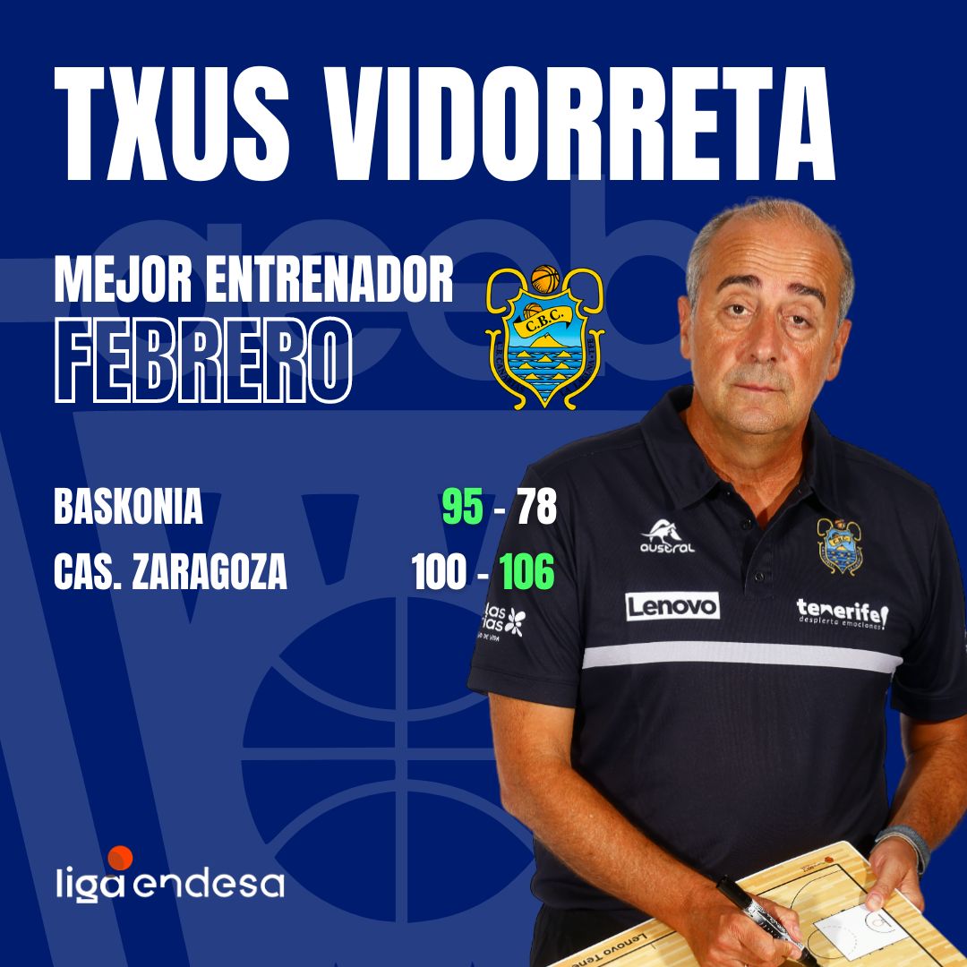 Tras la finalización de la vigesimosegunda jornada de la Liga Endesa y por los resultados obtenidos con su equipo (2 victorias y ninguna derrota), Txus Vidorreta, entrenador jefe del Lenovo Tenerife, ha sido designado como Mejor Entrenador del Mes de Febrero-Trofeo AEEB de la Liga Endesa por la Asociación Española de Entrenadores de Baloncesto.
