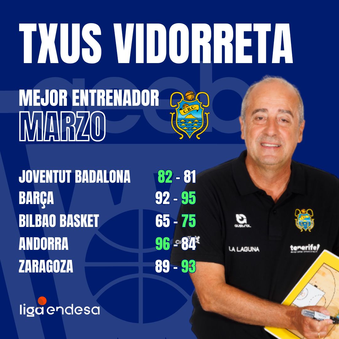 El gran momento del Canarias en la Liga Endesa ha tenido su recompensa para su técnico. Txus Vidorreta ha sido reconocido como el Mejor Entrenador del Mes de Marzo-Trofeo AEEB tras completar un impecable balance de cinco victorias y ninguna derrota durante este periodo.
