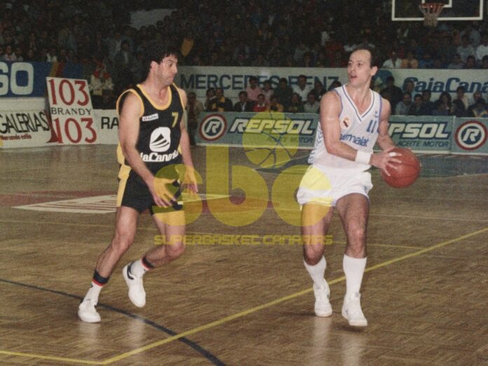 Las fotos rescatadas de nuestro archivo histórico que les mostramos en esta entrega, se hicieron el 3 de febrero de 1987 en el pabellón Juan Ríos Tejera de La Laguna. Después de una brillante campaña 1985-86, los aurinegros lograban el ascenso de categoría y el título de campeones de la extinta Primera División ‘B’. El siguiente curso baloncestístico comenzó la época dorada del mejor Canarias del Siglo XX en la máxima categoría del baloncesto estatal, en la fructífera, y también despiadada, década de los años 80.