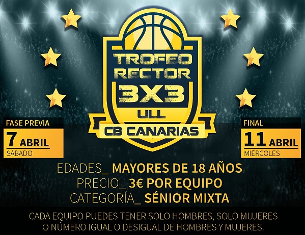La Laguna (Tenerife), 20 de marzo de 2018 – El CB 1939 Canarias y la Universidad de La Laguna (ULL) han abierto la inscripción para una nueva edición del Trofeo Rector 3×3, cuya fase previa tendrá lugar el sábado 7 de abril en el pabellón central de la Universidad lagunera, y antigua cancha de juego del CB Canarias, a partir de las 09.:00 horas. La final del certamen se celebrará el miércoles día 11 de abril, en el Santiago Martín, coincidiendo con el descanso del Canarias-Gipúzkoa de la Liga Endesa.